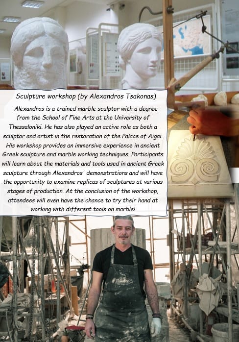 Spend a week to remember in Northern Greece, in the natural and constructed surroundings of the ancient Macedonians. Explore the captivating realm of ancient Macedonia! An exclusive 7-day programme designed to provide you with an in-depth understanding of the cultural and artistic achievements during the reign of King Philip II and Alexander the Great. Experience guided tours of key historical sites in the heart of Macedonia, including Vergina – Aegae, Pella, Dion, and Thessaloniki, where you can admire remarkable examples of ancient architecture, painting, sculpture, ivory work, jewellery, pottery, and more. Engage in hands-on workshops led by skilled artists in painting, sculpture, mosaic art, and pottery, allowing you to gain invaluable practical experience in the arts and crafts of ancient Macedonia. Spend an unforgettable week immersed in the natural beauty and historical significance of the ancient Macedonians and the influential figures who shaped the world!